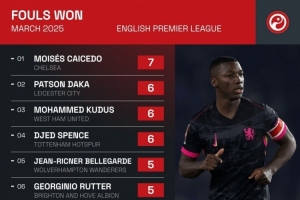 华体会首页-英超3月制造犯规次数榜:凯塞多7次居首,库杜斯6次&特罗萨德5次