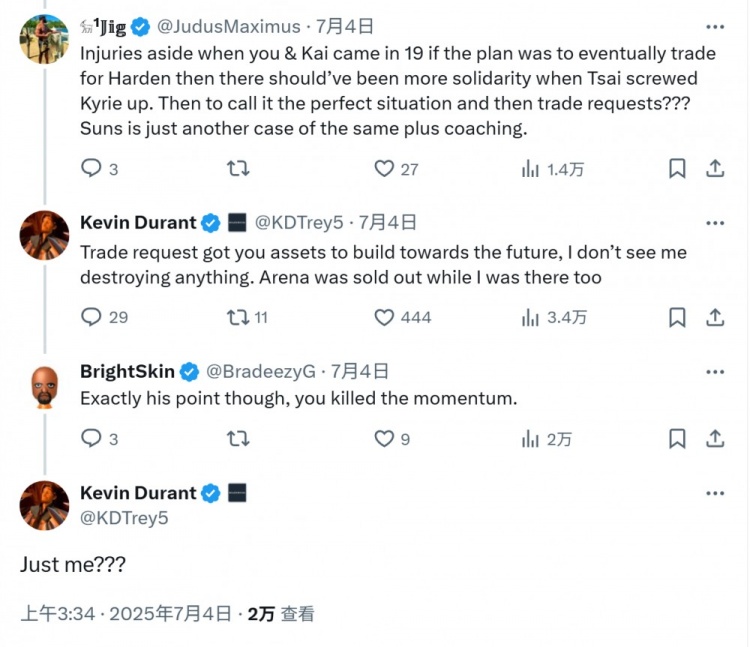 网友:“抛开伤病不谈,当你和欧文在2019年加盟篮网时,如果球队计划最终通过交易得到詹姆斯-哈登,那么在蔡崇信搞砸欧文的事情时,本应展现出更多的团结。之后你却称其为‘完美局面’,紧接着申请了交易???太阳队的情况不过是(上述情况的)又一个例子,再加上教练的问题罢了。”